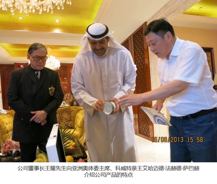 在艾哈邁德親王下榻的酒店內,王耀分別將以2001年亞太經合組織用瓷作為禮品特制仃的中餐、西餐、咖啡三套不同款式的瓷器和公司首席設計師洪蕾設計的寓意為“節(jié)節(jié)高”和“平安圖”的兩件瓷瓶分別贈送給霍震霆先生和艾哈邁德親王。親王對整個瓷器,無論是從外形還是到內涵表現出的陶瓷文化價值都給予極高的欣賞和贊許。與此同時,當了解到洪蕾首席設計師曾經先后為布什父子、08年北京奧運會設計陶瓷產品后更是對陶瓷股份公司贊不絕口。